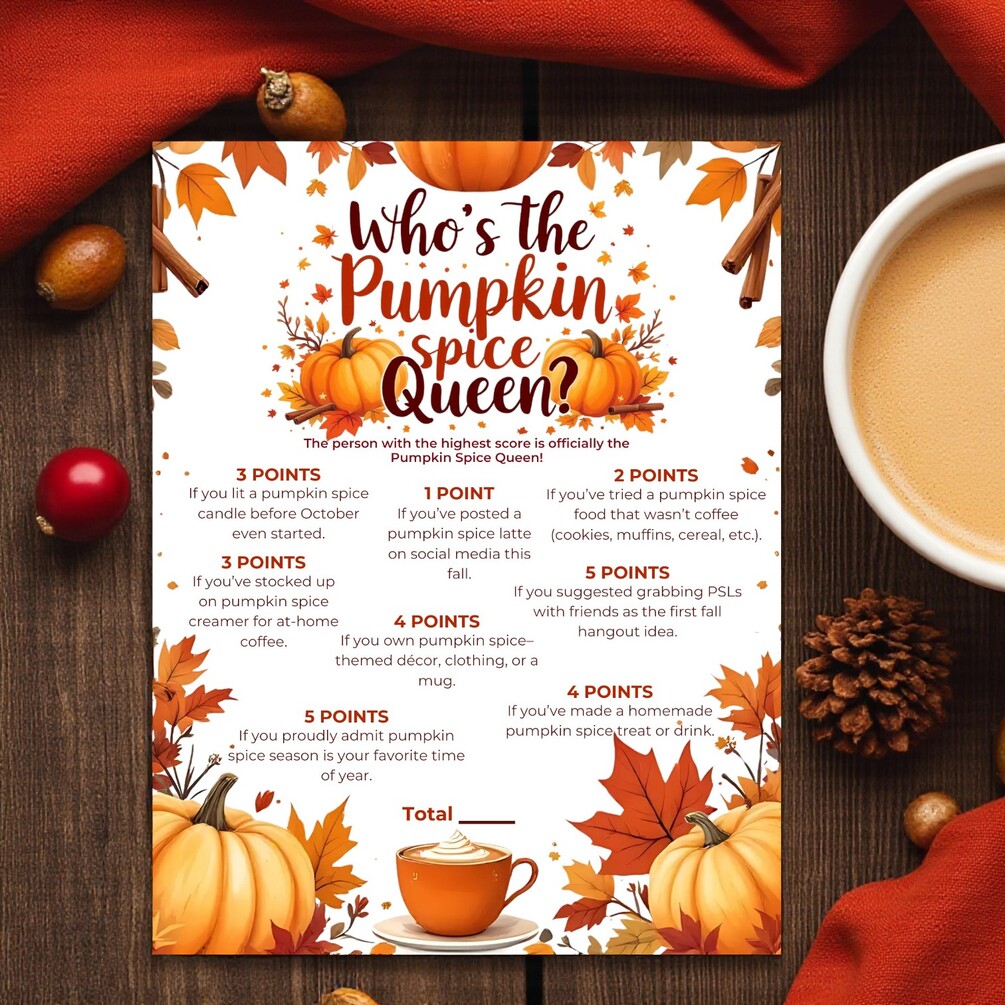 🎃👑 Spice up your autumn celebration with Pumpkin Spice Queen, the ultimate printable fall party game! Perfect for Friendsgiving, coffee nights, wine parties, or any cozy get-together, this game brings laughter and connection to your seasonal celebrations. Compete with friends to earn your crown and prove who rules pumpkin spice season!